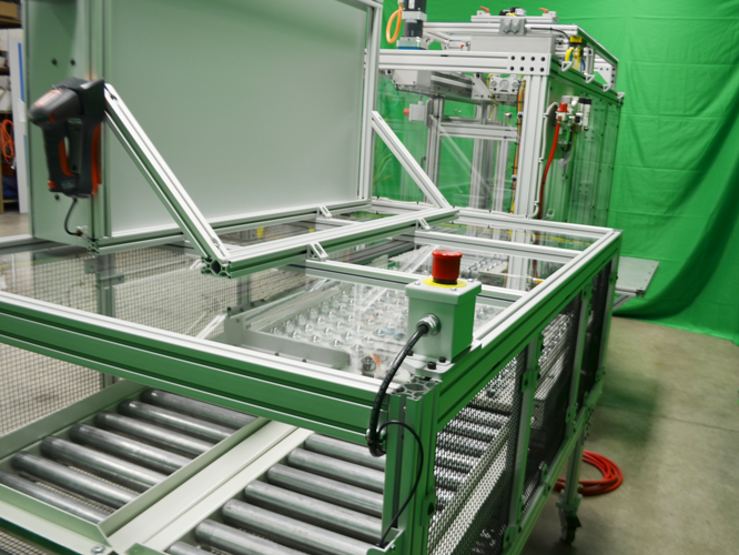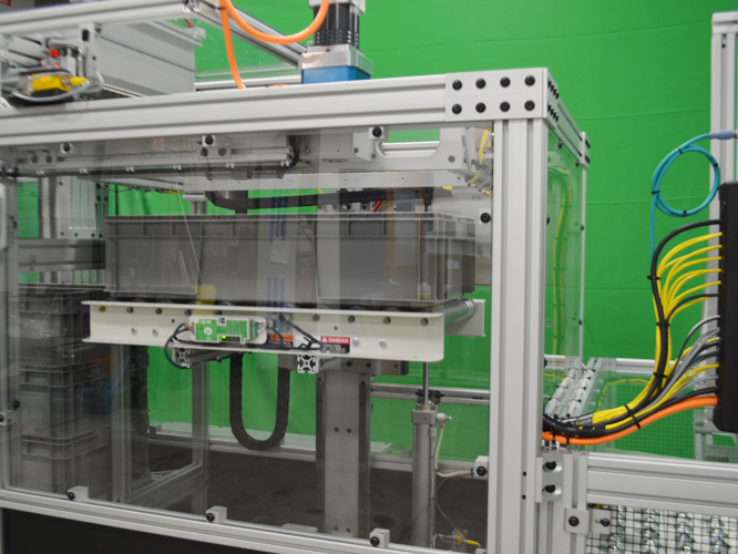 The operator loads four empty totes into the tote infeed elevator. The infeed elevator servo indexes one tote at a time into the servo driven horizontal tote transfer slide. The tote transfer slide then moves the empty tote underneath the conveyor outfeed. A Star robot places the product onto the product infeed conveyor. The conveyor is turned on moving the product into the tote below. The tote transfer slide indexes back and forth while filling to assist with product settling. Once the tote is full the tote transfer slide then moves the tote to the tote outfeed elevator and releases the tote. The tote outfeed elevator lowers the tote and enables the conveyor to send the tote to the out-feed toller conveyor.